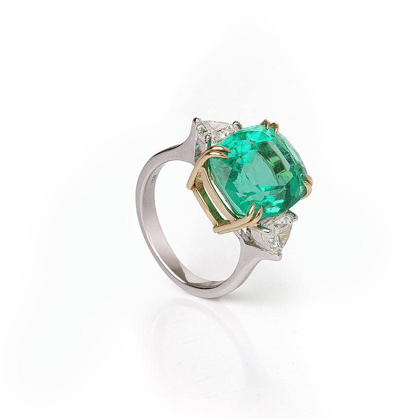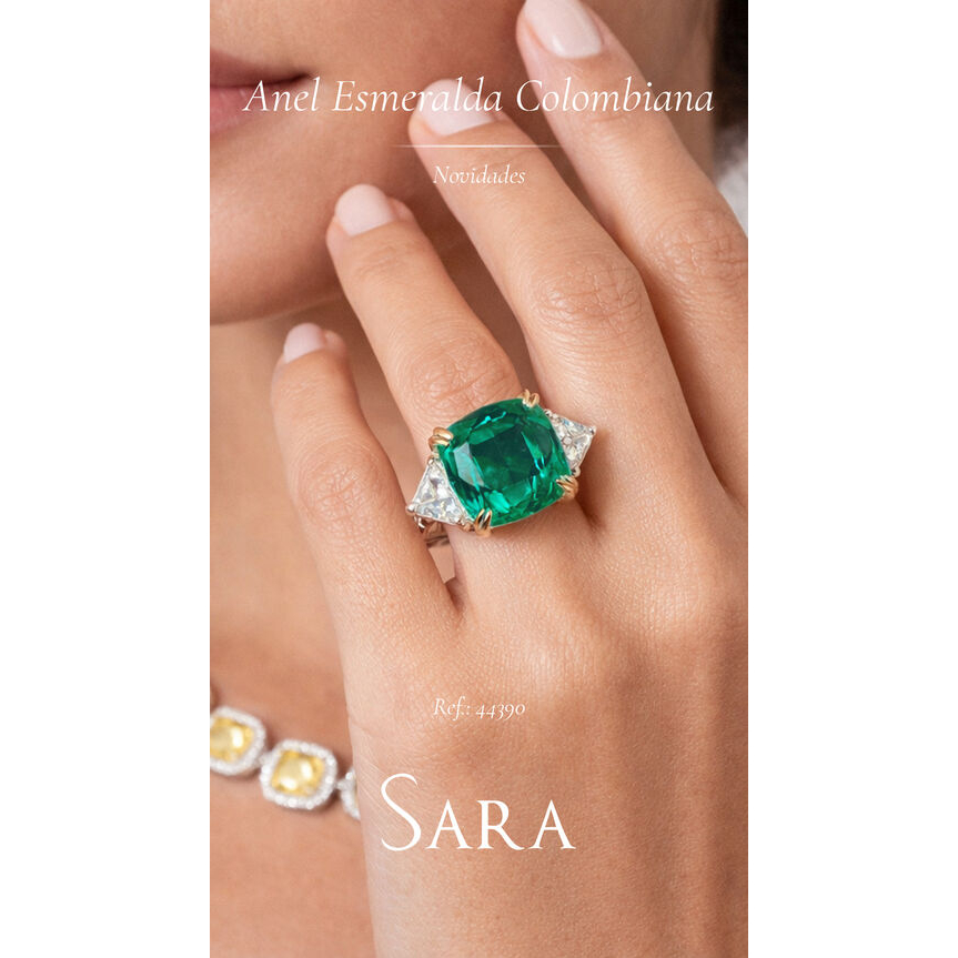 Anel confeccionado em ouro 18kt com esmeralda colombiana de 9,36 quilates, selecionada por sua cor intensa, transparência e origem nobre. A pedra central é acompanhada por diamantes lapidação triangular que totalizam 1,10 ct.