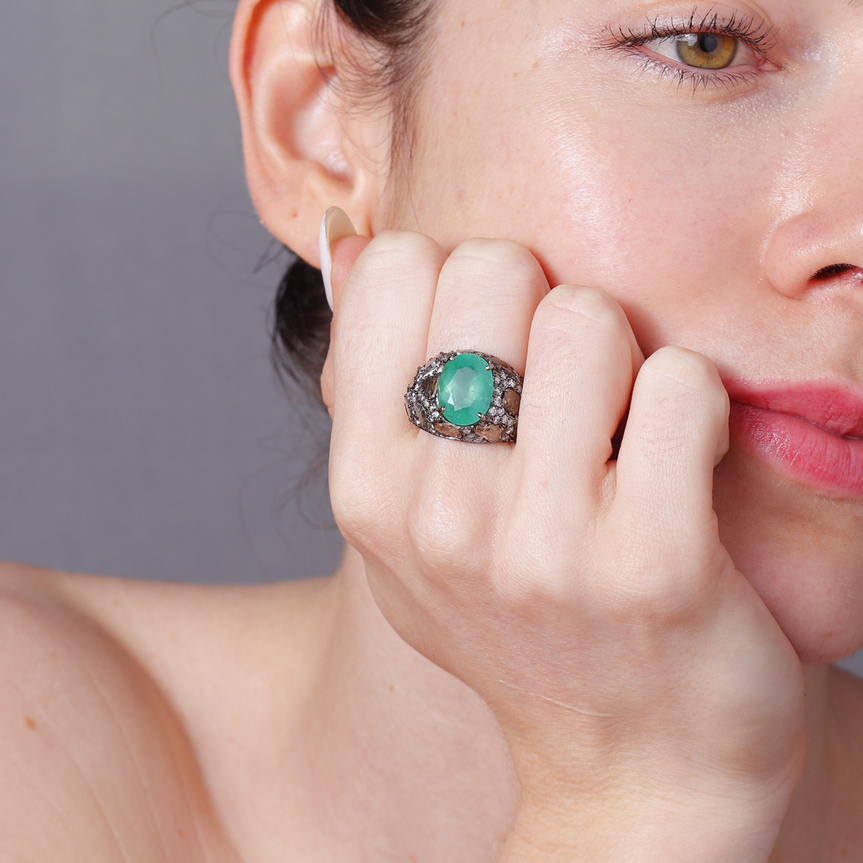 Anel em Ouro 18k com Esmeralda Oval Central e Lascas de Diamantes Lapidação Brilhante.