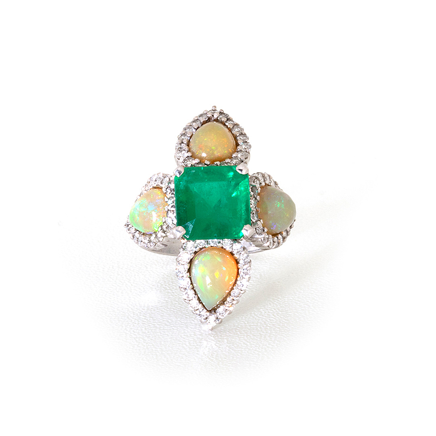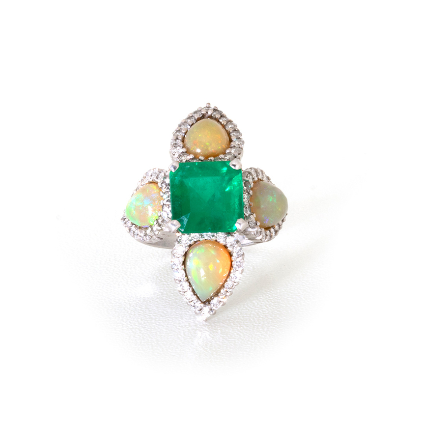 Anel em Ouro 18k com Esmeralda Quadrada, Opalas e Diamantes Lapidação Brilhante Briolet.