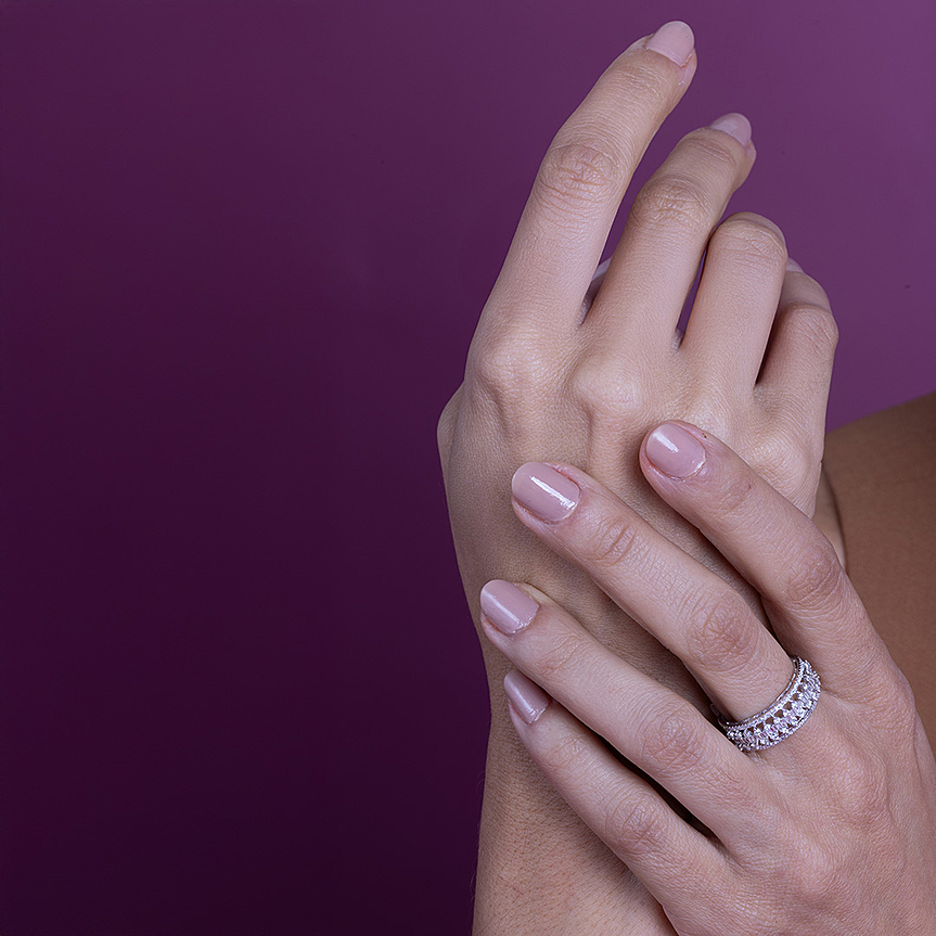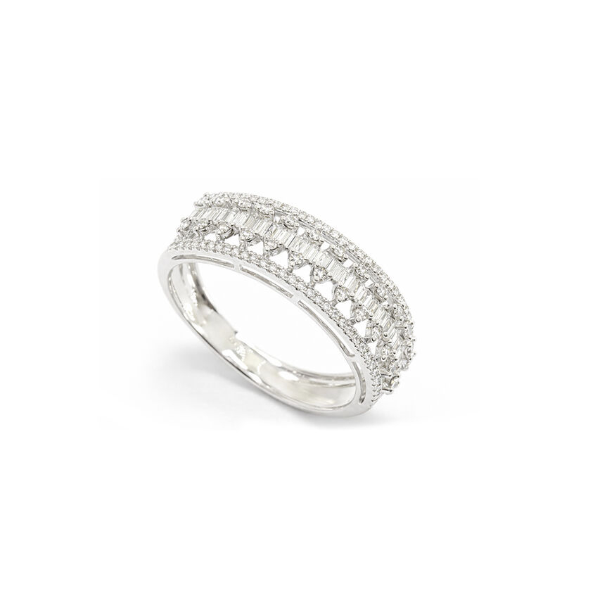 Anel com duas fileiras de 92 diamantes e baguete central que entrega brilho intenso e equilibrado.