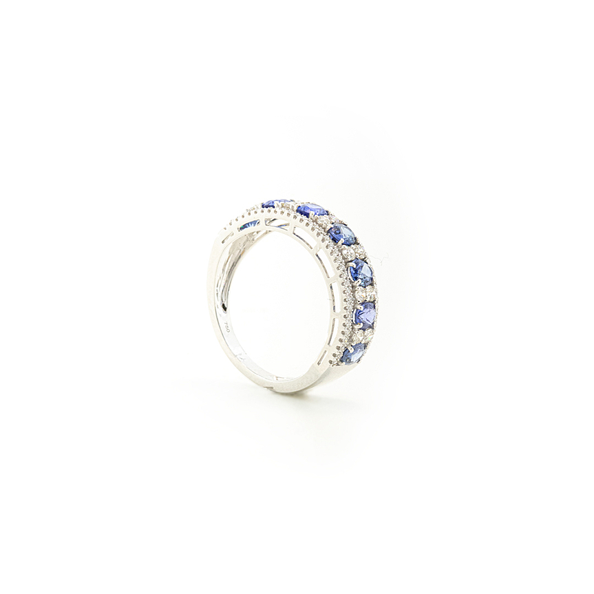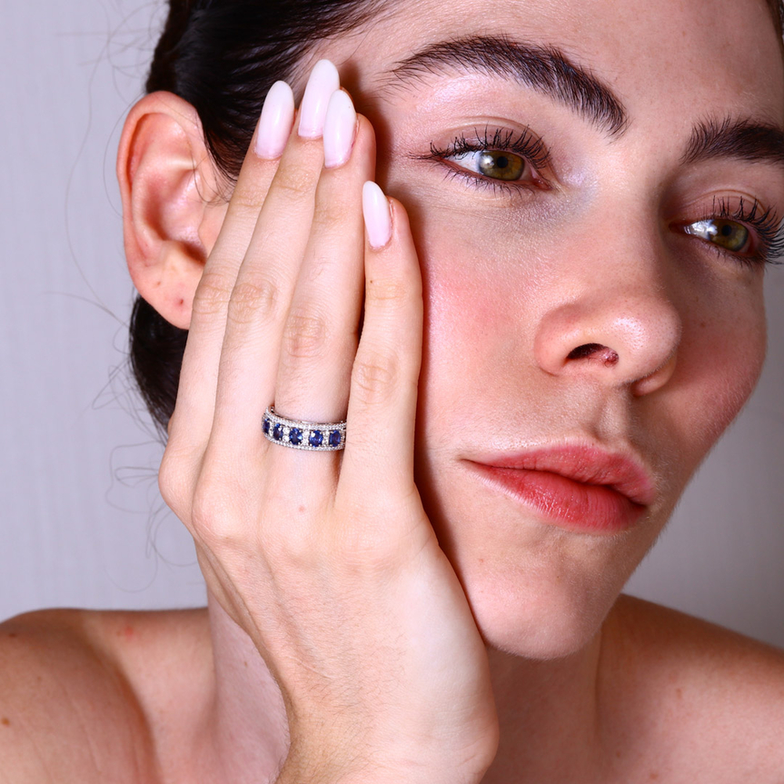 Meia aliança com safiras e diamantes que une cor vibrante e brilho sofisticado.