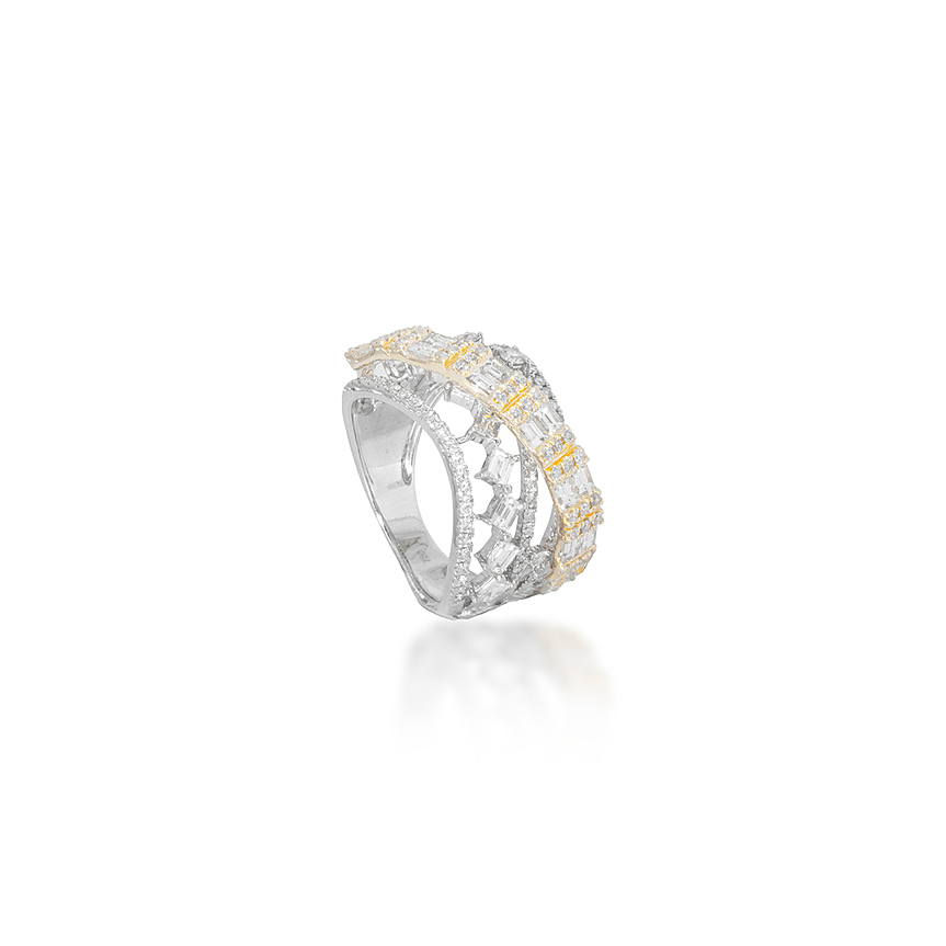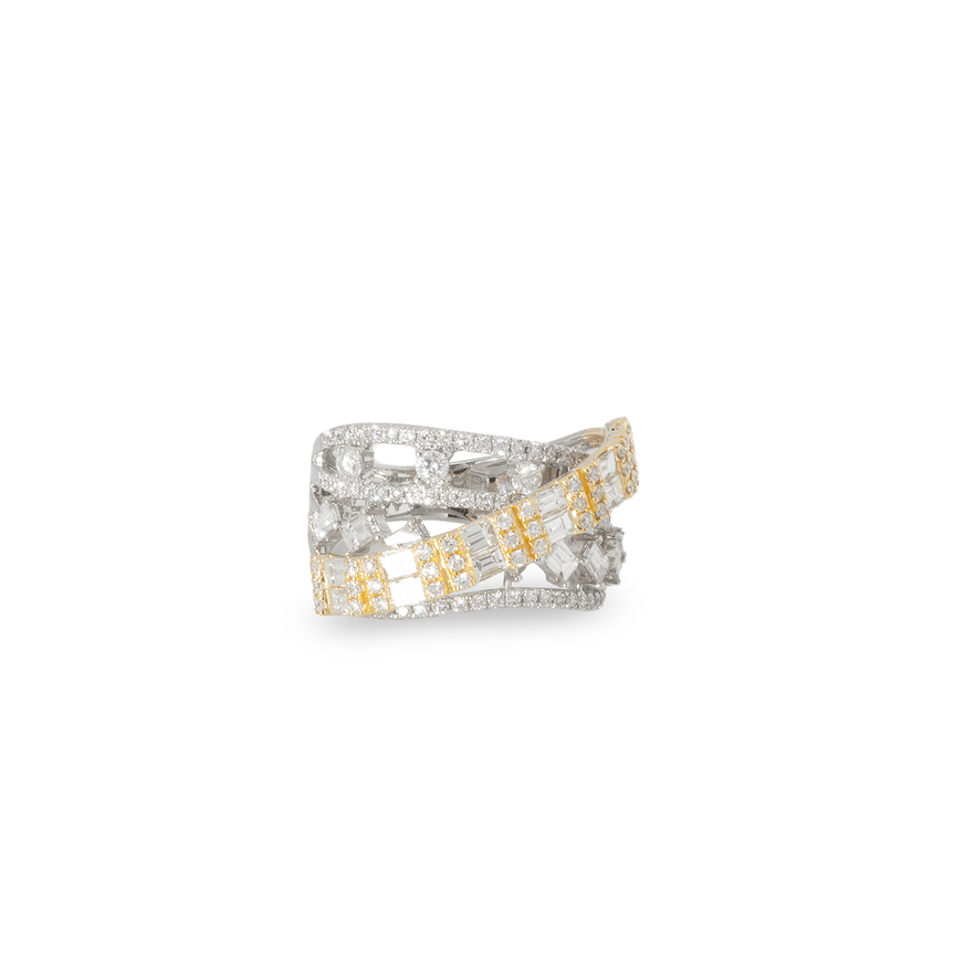 Anel trançado de baguetes brancos e amarelos que combina contraste e sofisticação.