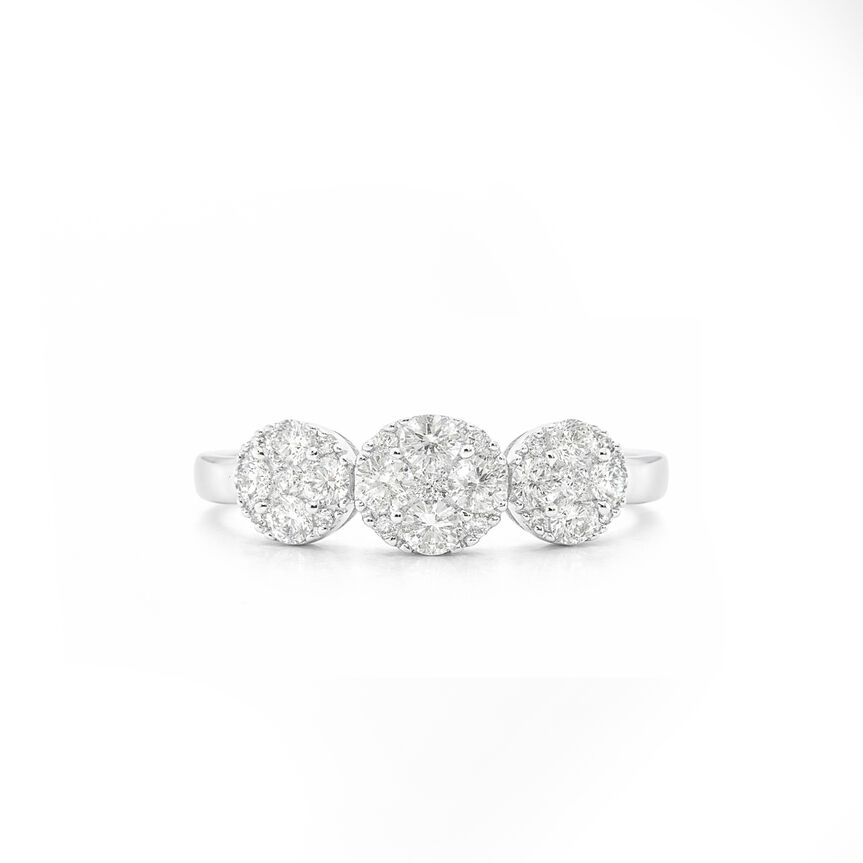 Anel com três pizzas redondas de diamantes.