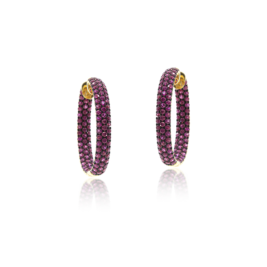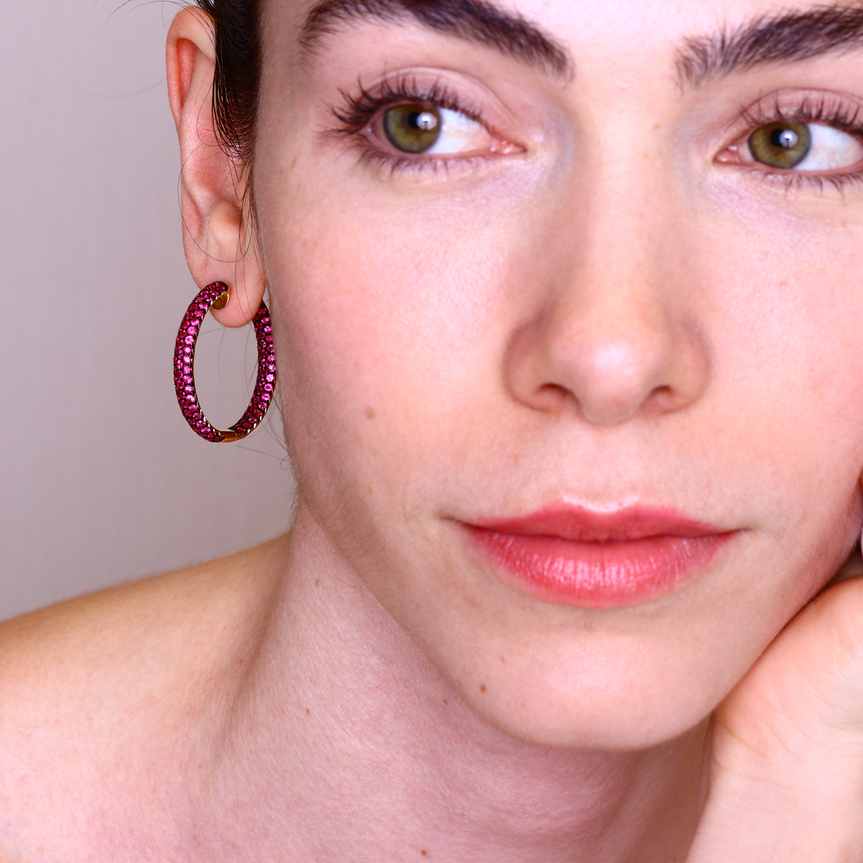 Argolas pavê de rubis que realçam cor intensa e brilho elegante.