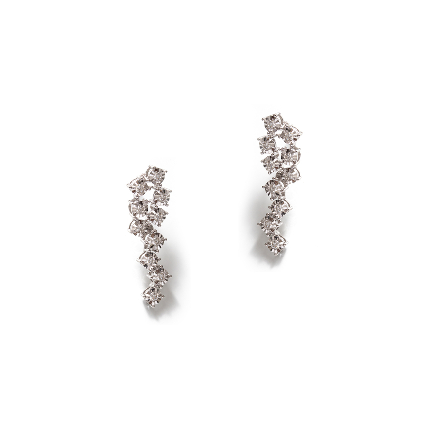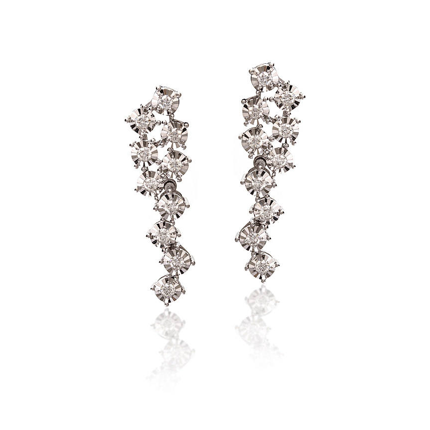 Brincos cascata de diamantes que criam movimento e brilho contínuo e sofisticado.