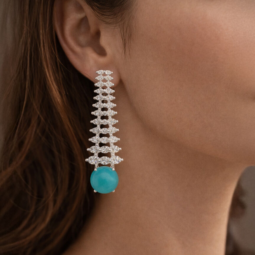 Brinco com três fios de navetes em degradê que cria movimento e brilho intenso.