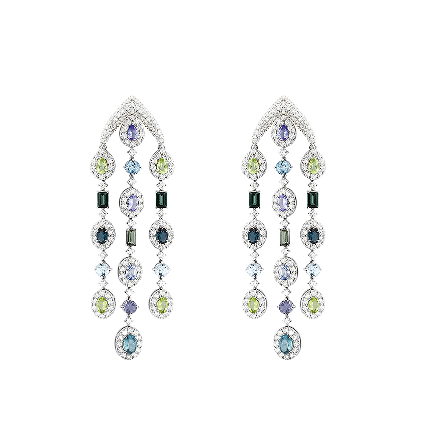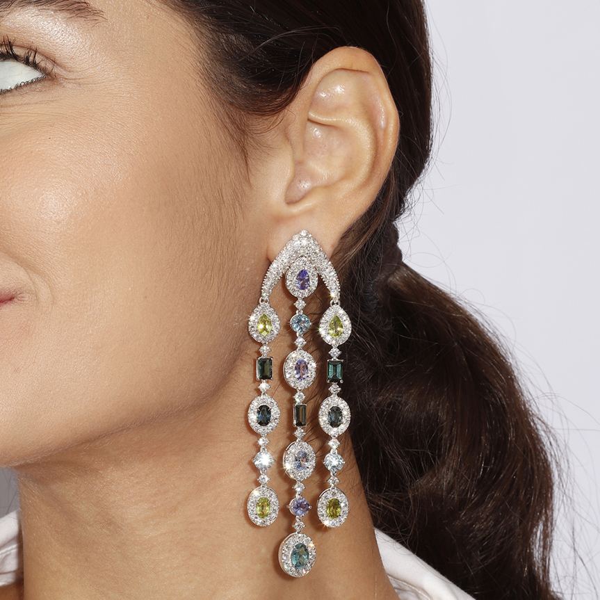 Brinco Franja SARA de Ouro 18k com mix de pedras de brilho intenso.