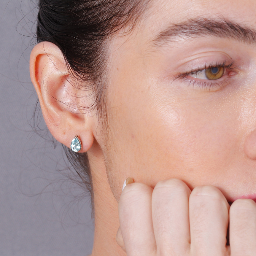 Brinco solitário em ouro branco 18k com turmalina paraíba brasileira em lapidação gota.