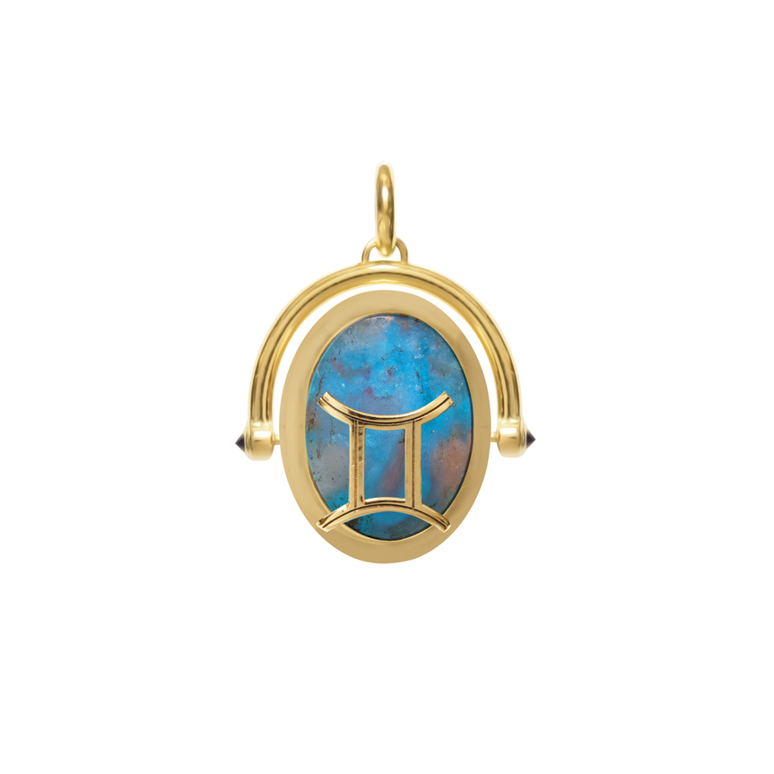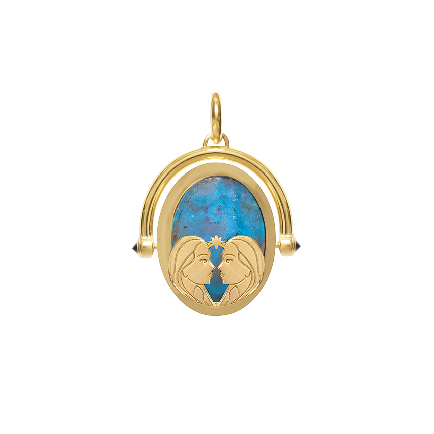 Pendente Gêmeos com Turmalina Paraíba de ouro 18kt que simboliza dualidade elegante com brilho tropical.