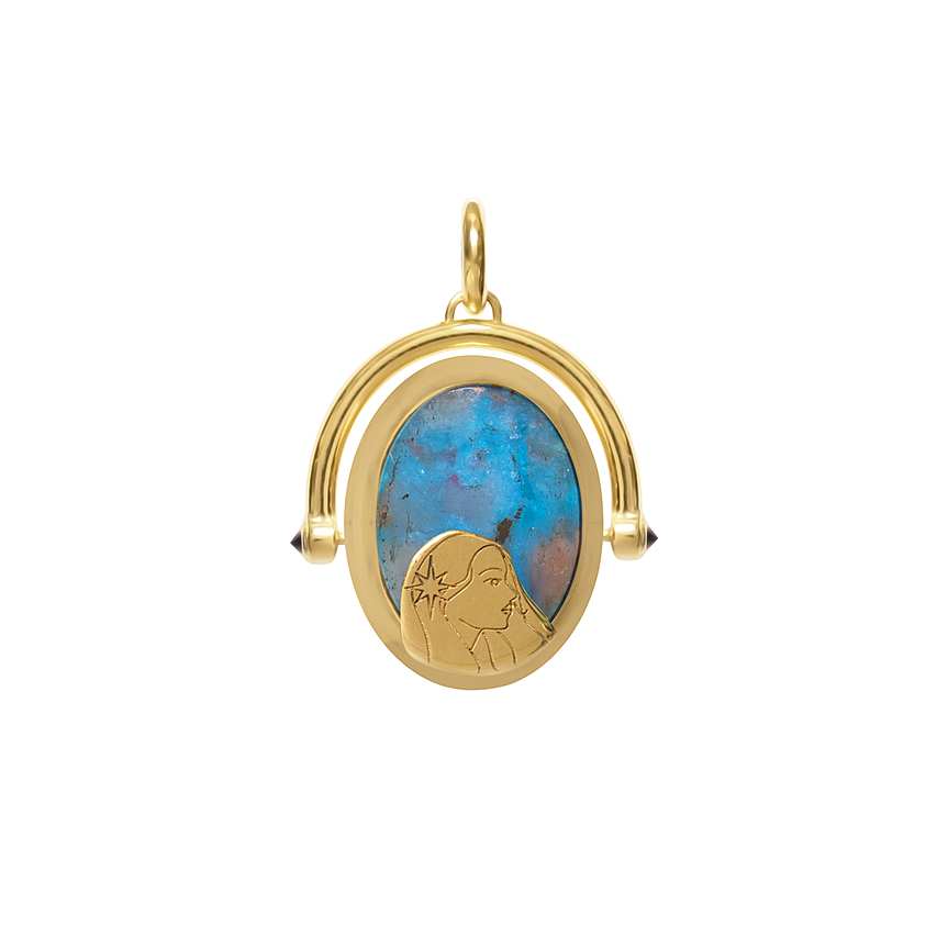 Pendente Virgem com Turmalina Paraíba de ouro 18kt que transmite pureza e luminosidade refinada.