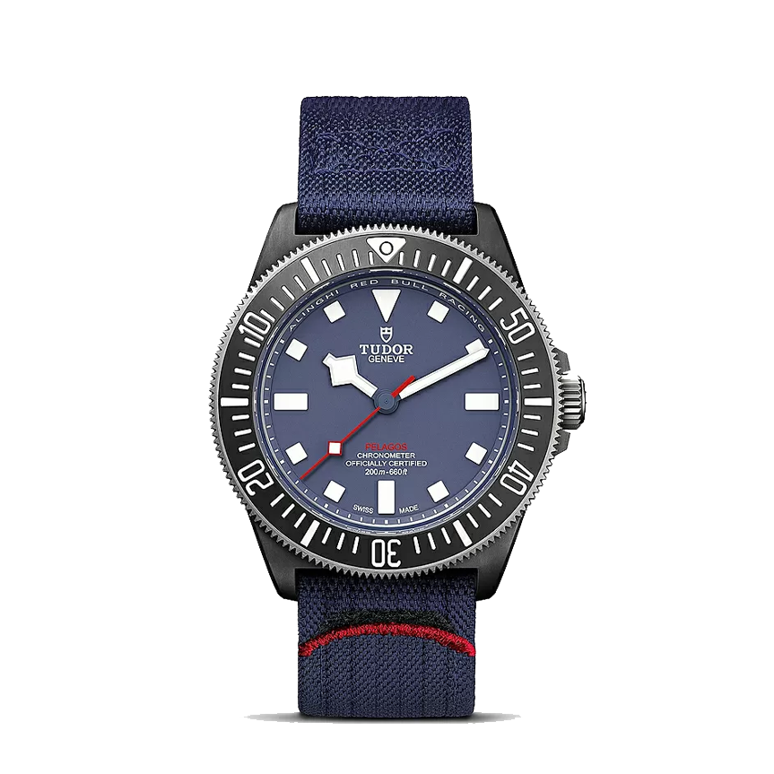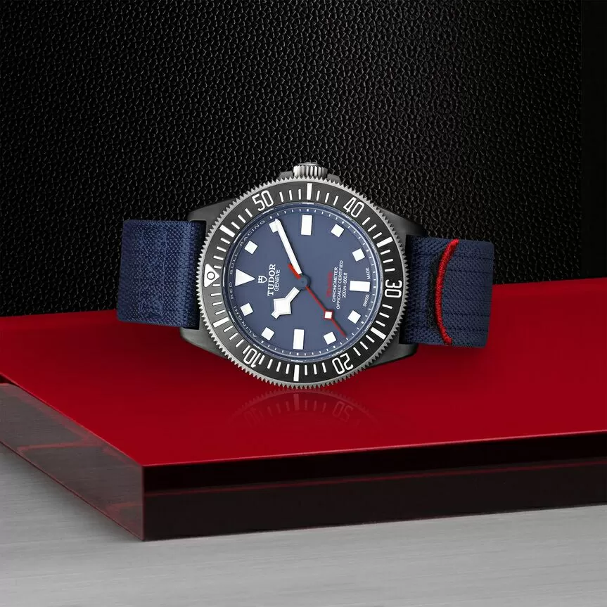 TUDOR Pelagos FXD M25707KN-0001. Caixa de 42 mm em compósito de carbono preto com acabamento mate e o logótipo Alinghi Red Bull Racing gravado no fundo de caixa, Coroa de titânio adornada com o escudo TUDOR em relevo, Vidro de safira plano, Estanque até 200 m, Bracelete em tecido azul de peça única .